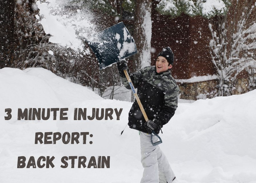 Next, offset your legs with one in front and one behind as if you were doing a short lunge. Place your hands with one on the back of the handle of the shovel and one in the front, and bend your knees and scoop the snow in a squatting motion. When you lift the shovel load, pivot at your hips, keeping your hips and shoulders in line, and dump the snow off to the side. When you are lifting and rotating you shouldn’t have any strain in the low back or neck, but you should feel your hips and legs working. All your movement and power should be done through your hips, not through your back. You also need to keep your back super straight, not rounding it, that way you are using your butt muscles and hamstrings more. Most likely you will have muscle soreness in your hips and hamstrings and legs, but that is much easier to deal with than a strained back.